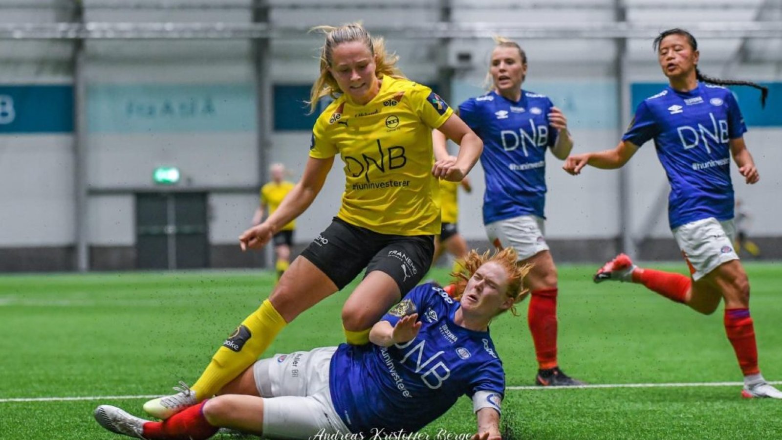 Innbytter Andradóttir slo et fint innlegg i boksen som Emilie Woldvik er først på, men det hjelper pent lite når hun header ballen rett i øret på Celin Bizet Ildhusøy.